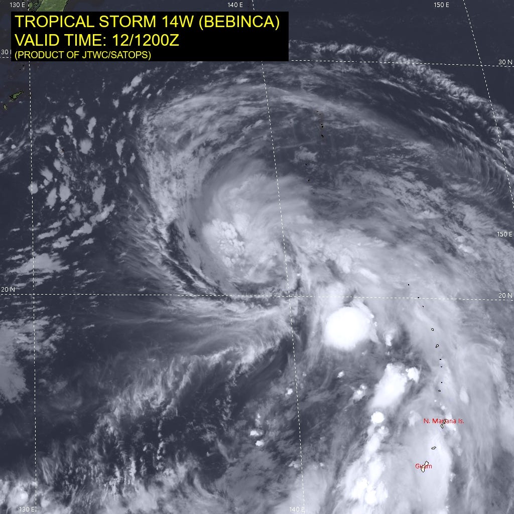 Tropical Storm Bebinca is located SSW of Iwo To and is moving north at 16 kt with max winds to 60 kt and significant wave heights to 8.5 meters, about 28 feet.