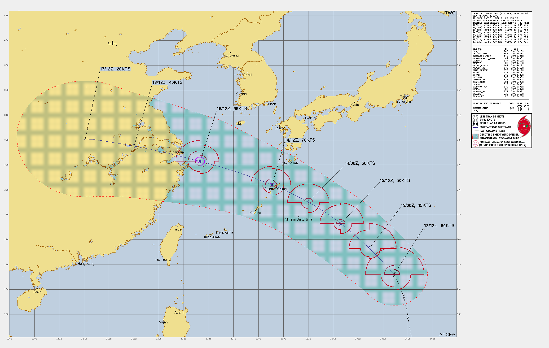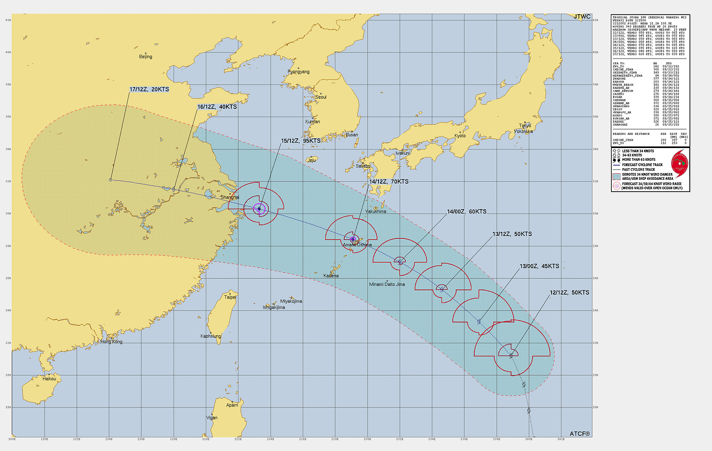 Bebinca is forecast to turn more towards the NW and eventually WNW. Rapid intensification is possible as the storm passes north of Okinawa in about 72 hr with a peak wind speed of 100-110 kts and max significant wave heights of 10-11 meters (33-36 ft). Landfall is expected near Shanghai about 1800 UTC on the 15th.
